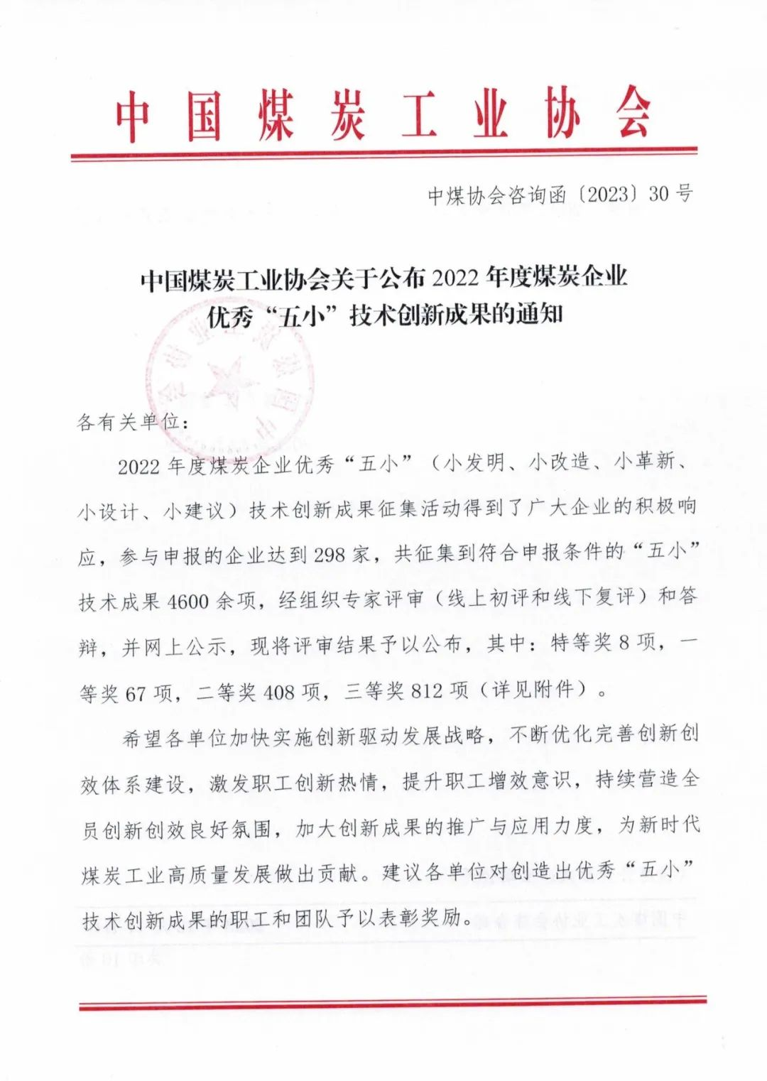 天地王坡多项成果荣获2022年度中国煤炭工业协会“五小”创新成果奖