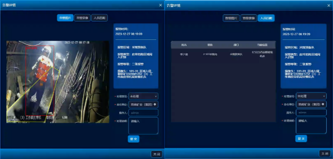 系统能对井下环境、危险区域、设备状态、人员违章行为、人员安全穿着等进行识别,及时预警与联动控制,达到安全隐患、违章行为、井下环境实时管控、预警的目标。该系统的创新之处在于,当检测到人员存在违章行为时,能自动抓拍并匹配井下作业人员,生成可疑人员报警记录,这一功能为全国首创。