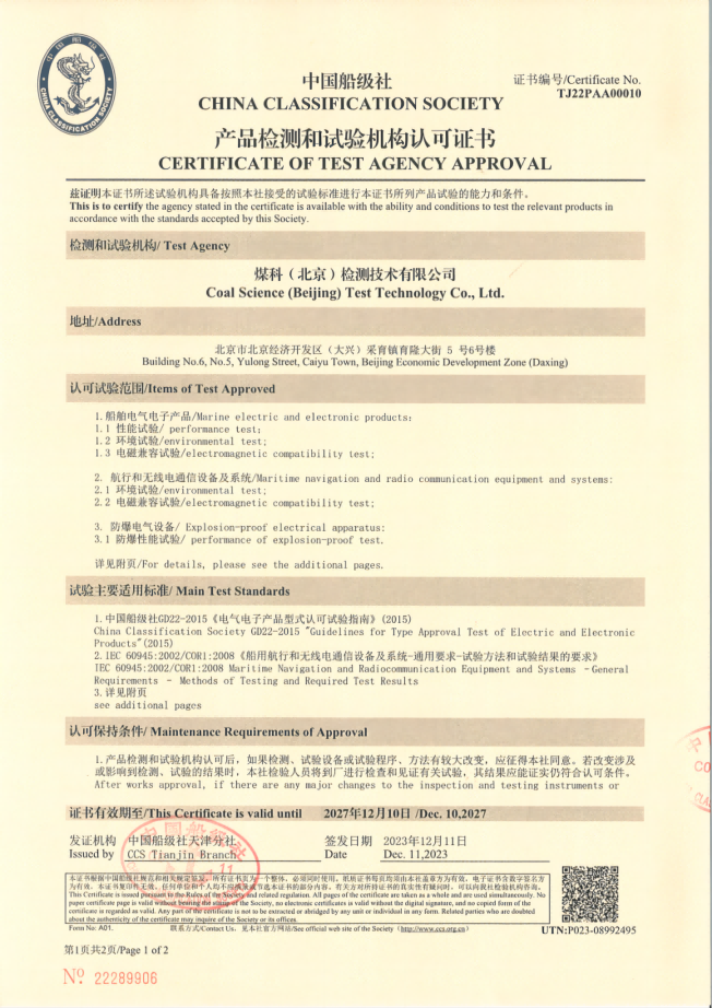 中国船级社(CCS)是我国唯一从事船舶入级检验业务的专业机构,主要依据国际公约、规则以及授权船旗国或地区有关法规,为船舶、海上设施及相关工业产品提供世界领先技术规范和标准,并提供认证认可等服务;主要认证业务板块涉及船舶电气电子产品和防爆电气设备检测,包括电磁兼容、电气性能、防爆电气等试验。中国船级社认可证书是企业进入船舶领域、海上设施及相关工业的“官方通行证”,具有极高的专业性与权威性。