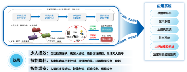 煤矿无人值守系统:按照“少人提效、节能降耗,无人则安、智能增安”的建设理念,充分利用计算机技术、信息技术、可编程技术、工业互联网技术、控制技术、人工智能等一系列技术手段,建立“多模感知+递阶控制+机器巡检”的作业模式,降低生产成本、提高劳动效率、节能降耗、提升安全性能。