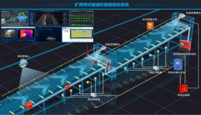 矿用带式输送机智能安控系统:融合机器视觉-听觉-触觉-巡检等多模态感知信息,通过人-机-环安全隐患表征模型自动判识带式输送机撕裂、堆煤、跑偏、打滑、电机和减速机和托辊异常、煤流大块、异物、水煤、煤流量、危险气体、光纤测温、皮带灭火、冒烟、人员闯入并实时预警,运用三层递阶控制实现带式输送机减人提效、节能降耗,保障了带式输送机安全、高效运行。