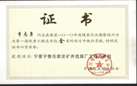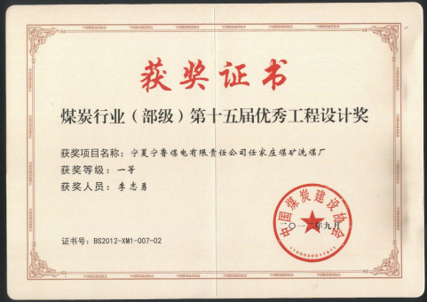 1.宁夏宁鲁煤电有限责任公司任家庄煤矿选煤厂获中国勘察设计协会“总承包金钥匙奖(国家一等奖,2011年)”、“煤炭行业第十五届优秀设计一等奖” 、中国煤炭建设协会“总承包金钥匙奖(行业一等奖,2010年)”