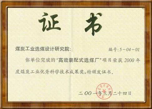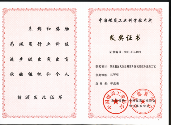 10.“预先脱泥无压给料重介旋流高效分选新工艺” 中国煤炭工业科学技术奖 三等奖(2007年)