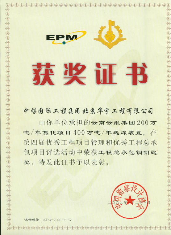 8.云南云维集团200万吨/年焦化工程选煤装置获中国勘察设计协会“总承包铜钥匙奖(国家三等奖,2009年)