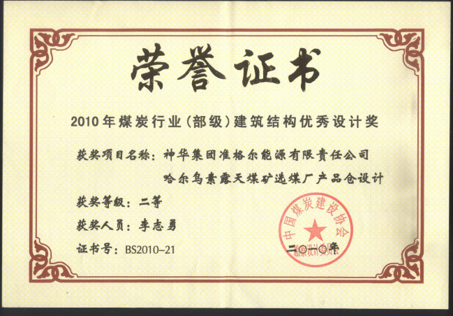 9.哈尔乌素选煤厂产品仓设计获中国煤炭建设协会“建筑结构优秀设计奖” ( 2010年)