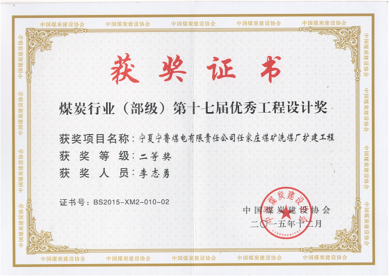 4.“宁夏宁鲁煤电有限责任公司任家庄煤矿洗煤厂扩建工程”获煤炭行业第十七届优秀工程设计二等奖(2015年)