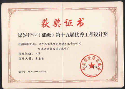 2.神华集团准格尔能源有限责任公司哈尔乌素露天煤矿选煤厂获“煤炭行业第十五届优秀设计一等奖” (2012年)