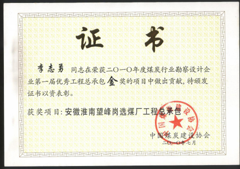 7.淮南矿业集团望峰岗选煤厂改扩建工程获中国勘察设计协会“总承包铜钥匙奖(国家三等奖,2011年)”、中国煤炭建设协会“总承包金钥匙奖(行业一等奖,2010年)”