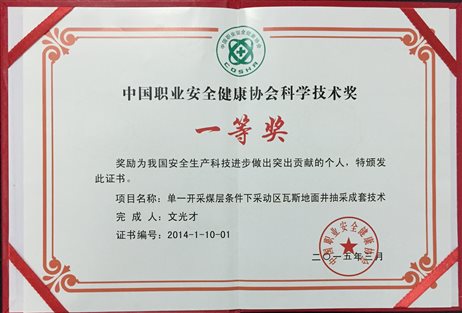 (8)2014年“单一开采煤层条件下采动区瓦斯地面井抽采成套技术”获中国职业安全健康协会科学技术奖一等奖;