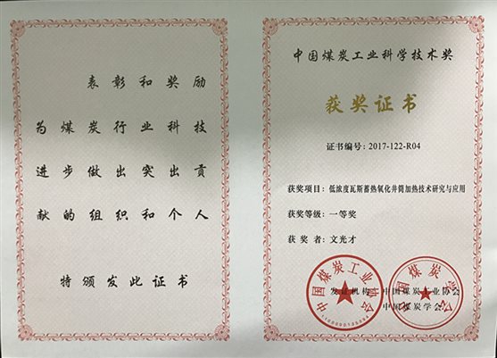 (5)2017年“低浓度瓦斯蓄热氧化井筒加热技术研究与应用”获中国煤炭工业科学技术奖一等奖;