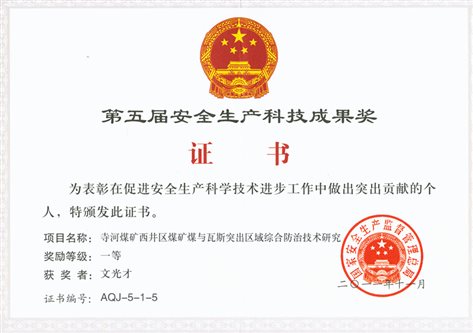 (10)2011年“寺河煤矿西井区煤矿煤与瓦斯突出区域综合防治技术研究”获第五届安全生产科技成果奖一等奖。