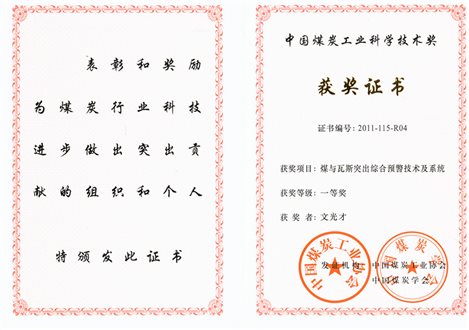 (9)2011年“煤与瓦斯突出综合预警技术及系统”获中国煤炭工业科学技术奖一等奖;