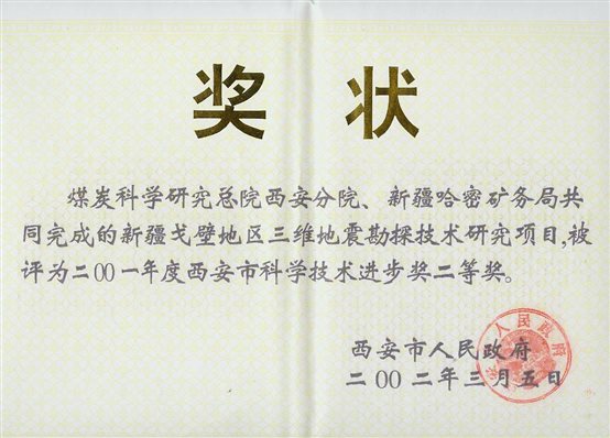 9 | 新疆戈壁地区三维地震勘探技术研究 | 陕西省科技进步奖 | 三等奖 | 2003 | 6 |