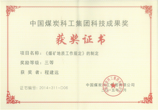 3 | 《煤矿地质工作规定》 | 中国煤炭科工集团科技成果奖 | 三等奖 | 2015 | 6 |