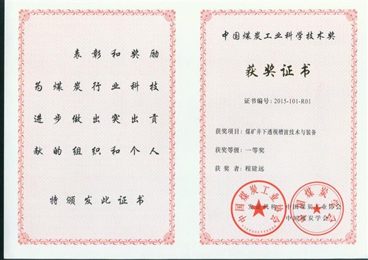 1 | 煤矿井下透视槽波地震技术与装备 | 中国煤炭协会科学技术奖 | 一等奖 | 2015 | 1 |