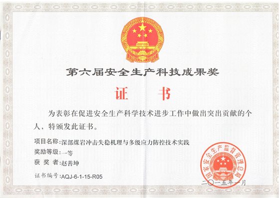 深部煤岩冲击失稳机理与多级应力防控技术实践,2015年,国家安全监管总局,省部一等奖,排名第5;