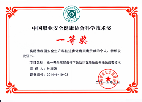 (2)中国职业安全健康协会科学一等奖:单一开采煤层条件下采动区瓦斯地面井抽采成套技术