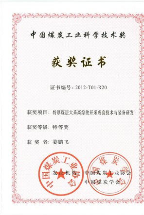 1、特厚煤层大采高综放开采成套技术与装备研发,2012年,中国煤炭工业科学技术特等奖,排名第20;