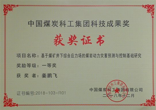 12、基于煤矿井下综合应力场的煤岩动力灾害预测与控制基础研究,2018年,中国煤炭科工集团科技成果一等奖,排名第1。