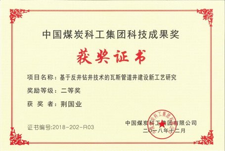 4.2018年“基于反井钻井法的瓦斯管道井建设新工艺研究”获中国煤炭科工集团科技成果二等奖