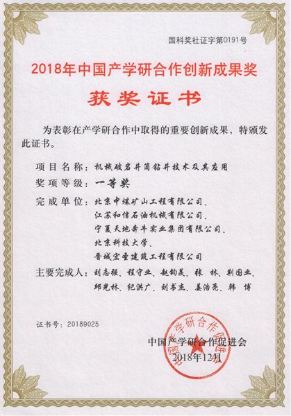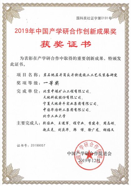 1.2019年“岩石地层井筒反井快速施工工艺及装备研究”获中国产学研合作创新成果一等奖