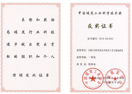 2.2018年“长斜大直径定向反井钻井工艺及装备研究”获中国煤炭工业科学技术一等奖