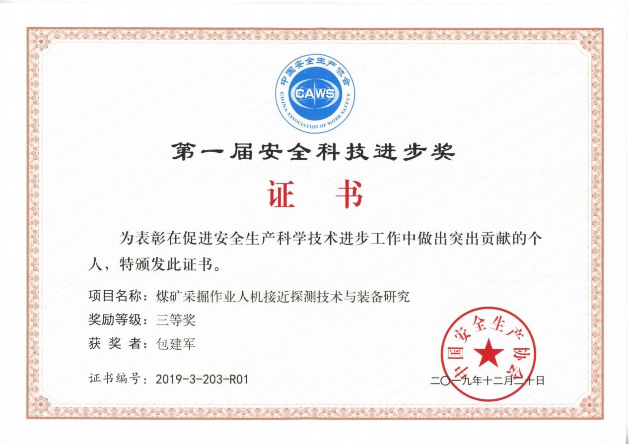 8、煤矿采掘作业人机接近探测技术与装备研究,2019年,第一届安全科技进步奖三等奖,排名第1;