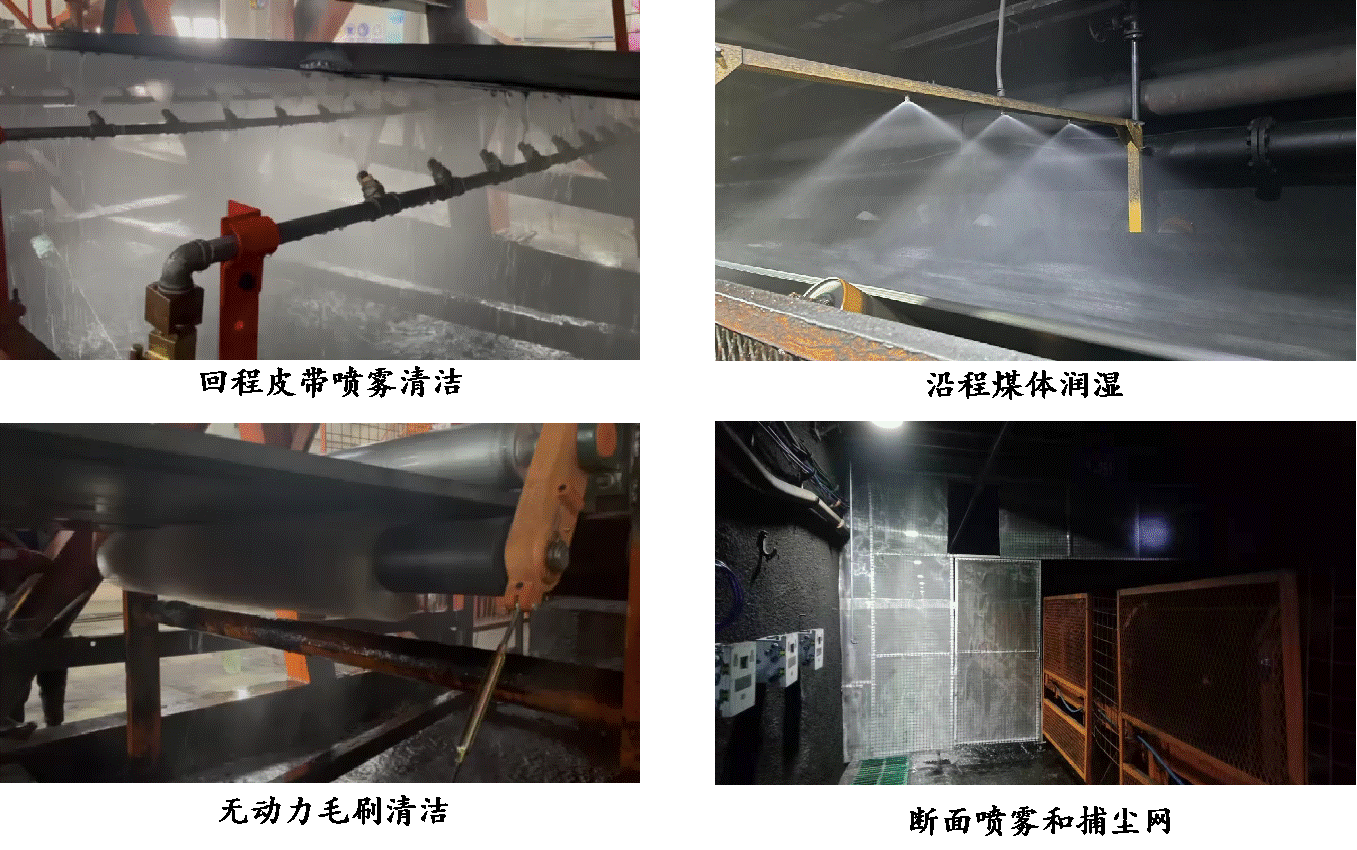 (3)研究了主运大巷“皮带清洁+断面喷雾+除雾捕尘网+沿程煤体润湿”的粉尘防治成套技术,研制了无动力皮带底部清洁装置、波纹板除雾式断面捕尘门等成套装备,实现了回程皮带表面的及时清洁、运输煤体表面的持续保湿、巷道风流细微粉尘的喷雾沉降、以及尘雾碰撞凝并后的快速消除,有效降低了矿井主要运输巷道内的粉尘浓度,且巷道内视线清晰无水雾。
