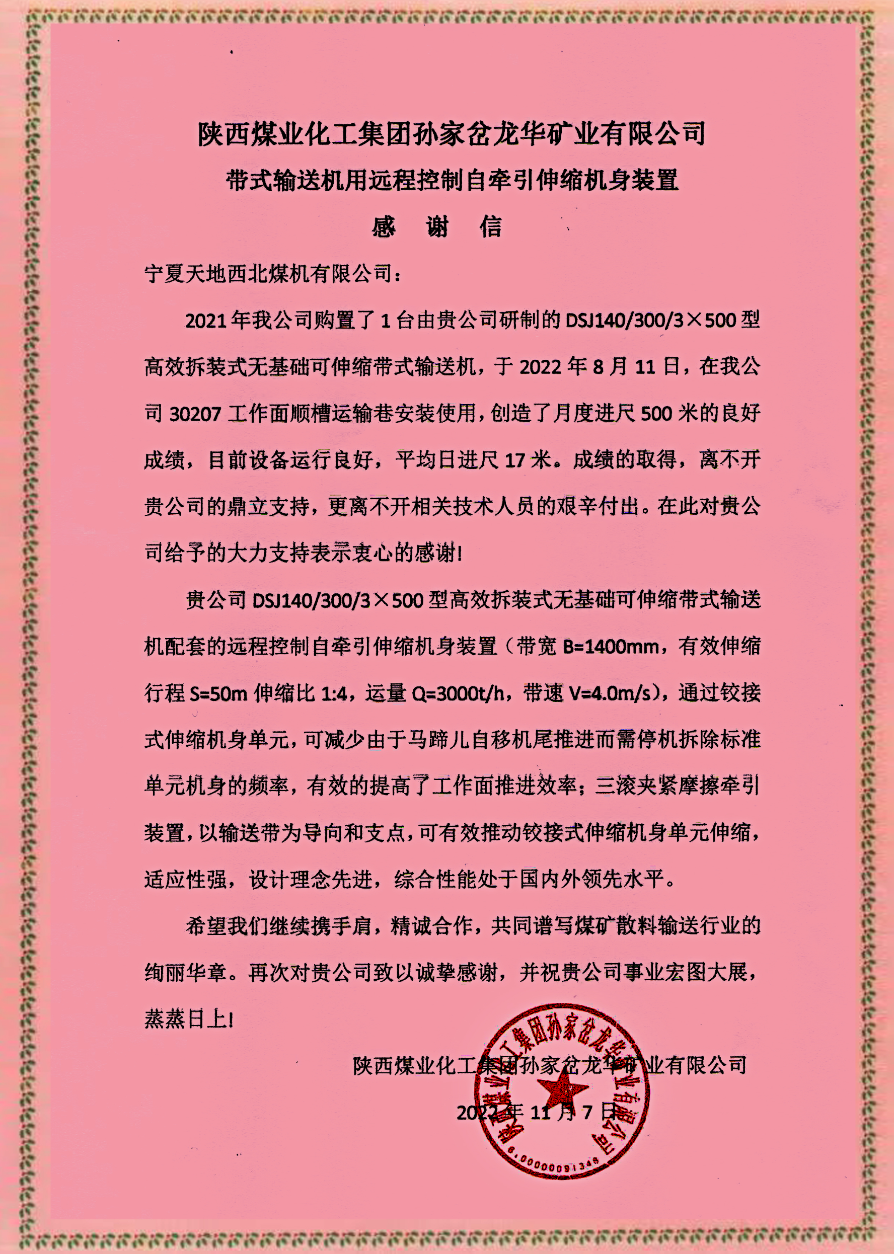 近日,中煤科工集团上海有限公司所属宁夏天地西北煤机有限公司(以下简称西北煤机)研制的国内首套可伸缩带式输送机用远程控制自牵引伸缩机身装置,在陕西煤业化工集团孙家岔龙华矿业有限公司30207工作面运转成功,创造了月度回采500米的良好成绩,用户对该自牵引伸缩机身装置给予了充分的肯定,于2022年11月7日发了感谢信。