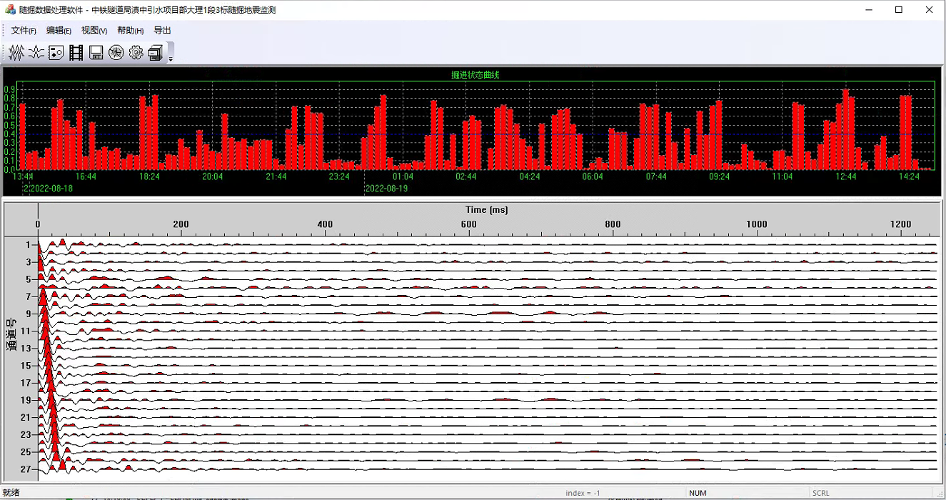 为实时超前预报TBM掘进前方的地质构造,确保TBM隧道掘进施工安全高效,西安研究院将自主研发的矿用本安型YSD-3随掘地震超前探测系统应用于该隧道。该系统以TBM掘进时截割岩壁产生的连续震动作为震源,通过连续高精度同步采集、在线高速传输、实时自动处理及“长曝光”叠加成像等技术实现TBM掘进前方地质异常体的高精度实时监测。有效解决了TBM盾构施工过程中常规方法难以有效施展的难题。