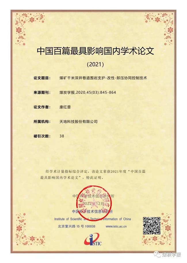 2022年12月29日,中国科学技术信息研究所发布了本年度中国科技论文统计报告。开采研究院党委书记、董事长康红普院士论文“煤矿千米深井巷道围岩支护-改性-卸压协同控制技术”入选2021年度“中国百篇最具影响国内学术论文”,是煤炭行业唯一入选论文。