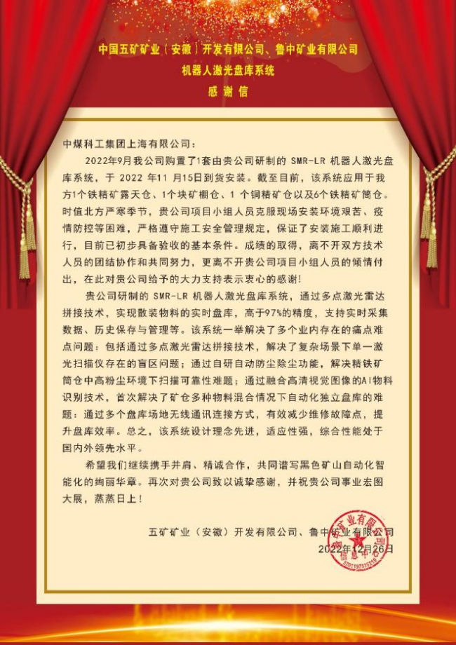 近日,上海煤科智能控制事业部收到中国五矿矿业(安徽)开发有限公司、鲁中矿业有限公司的“感谢信”,信中对人工智能创新团队研制的SMR-LR机器人激光盘库系统给予了高度表扬,表示该系统技术先进,精度提升,有效解决了业内存在的多个痛点难点问题,综合性能处于国内外领先水平!