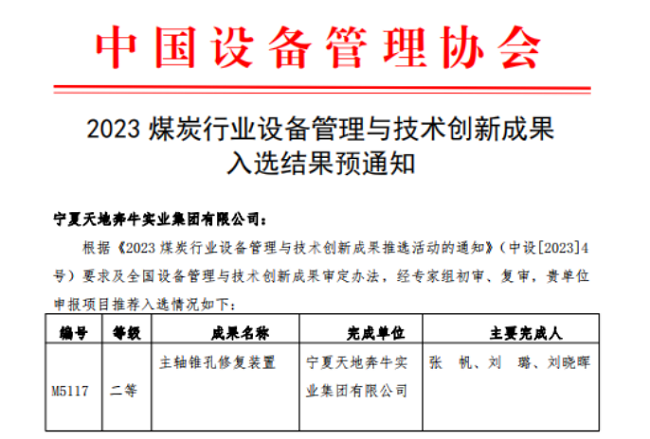 近日,中国设备管理协会公布了2023设备管理与技术创新成果入选结果,天地奔牛申报的“主轴锥孔修复装置”荣获煤炭行业设备管理与技术创新成果二等奖,这是天地奔牛深入贯彻落实创新驱动战略,持续强化设备创新管理的成功实践。