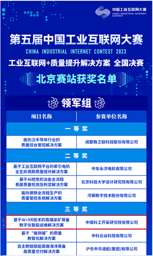 近日,第五届中国工业互联网大赛北京赛站决赛落下帷幕,开采研究院报送的“基于AI+XR技术的高端采矿装备数字化智能运维解决方案”项目获评三等奖,成功晋级全国总决赛。