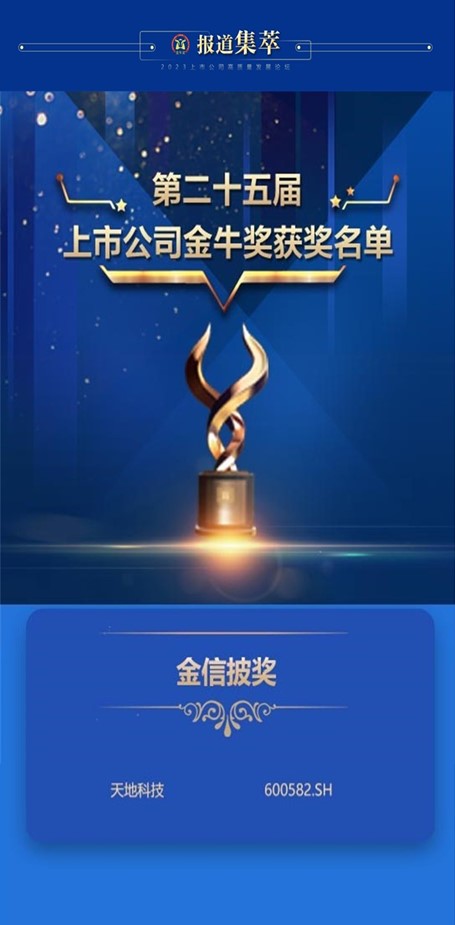 近日,由中国证券报主办的“2023上市公司高质量发展论坛暨第二十五届上市公司金牛奖颁奖典礼”在江苏南通举行。天地科技股份有限公司(股票简称:天地科技,股票代码:600582.SH)凭借在信息披露、投资者关系管理等方面的优异表现,荣获“第二十五届上市公司金信披奖”。