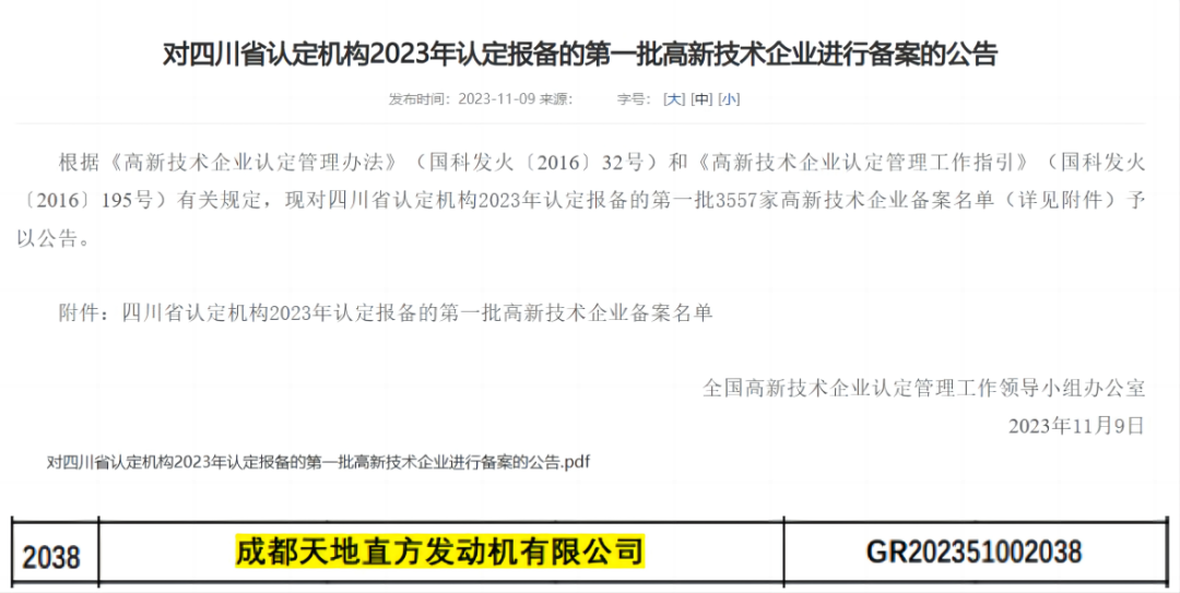 近日,全国高新技术企业认定管理工作领导小组办公室发布了四川省认定机构2023年认定报备的第一批高新技术企业名单,山西煤机所属子企业成都天地直方发动机有限公司(下称“成都直方”)顺利通过复审认定,再次被授予“国家高新技术企业”称号。